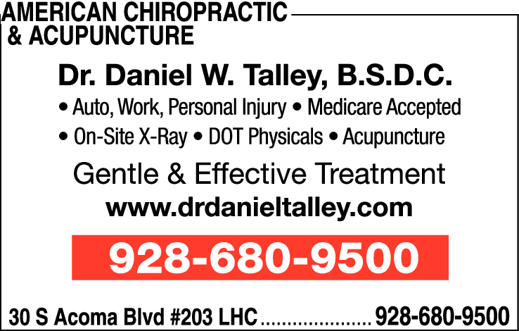 Gentle & Effective Treatment. Dr. Daniel W. Talley, B. S. D. C. Auto, Work, and Personal Injury. Medicare Accepted. On-Site X-Ray. DOT Physicals. Acupuncture.